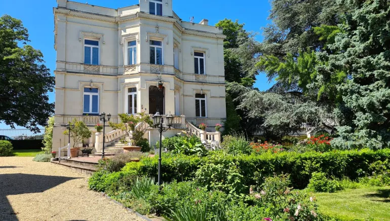 Entrez dans le village "Les Rosiers sur Loire" à Gennes-Val-de-Loire. Poussez les deux grandes grilles en fer forgé grises, traversez le parc, montez les escaliers en pierre et faites sonner la cloche du perron. C'est ici que vous accueille Odile Bousselin, la propriétaire de cette magnifique demeure bourgeoise angevine du XIXème siècle. Retournez-vous depuis le balcon de la porte d'entrée, vous pouvez observer le parc verdoyant orné de sapins, tilleuls et même une roseraie.