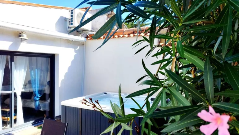 En extérieur la maison dispose d'une terrasse et d'un spa privatif chauffé toute l'année, exposé plein sud idéal pour prendre des couleurs.