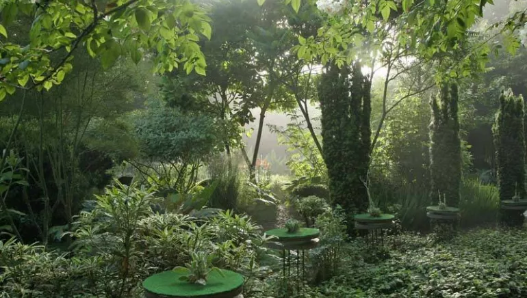 Au détour d’un sentier, des œuvres contemporaines en résonance au jardin surprennent le visiteur..