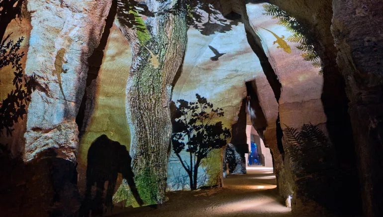 A travers une promenade scénographique souterraine, le visiteur est transporté dans l'univers sous-marin présent à Doué-la-Fontaine il y a 10 millions d'années. Projection d'un film didactique, jeux de lumière, parois irisées de bleu, ballet de poissons, miroir d'eau... En parcourant ces caves, on découvre l'histoire du site et les bouleversements géologiques qui l'ont vu naître, les animaux qui l'ont peuplé et les hommes qui l'ont creusé. Un fabuleux voyage entre terre et mer, passé et présent, rêve et science.